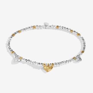Armbåndet er laget i sølvforgylt metall med detaljer i gullforgylling, og prydes av tre delikate hjerteanheng som symboliserer kjærlighet, omtanke og samhold.