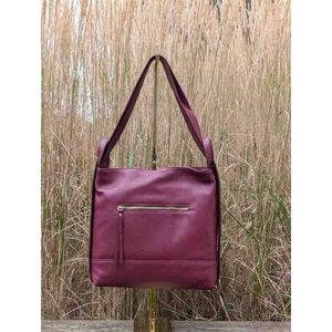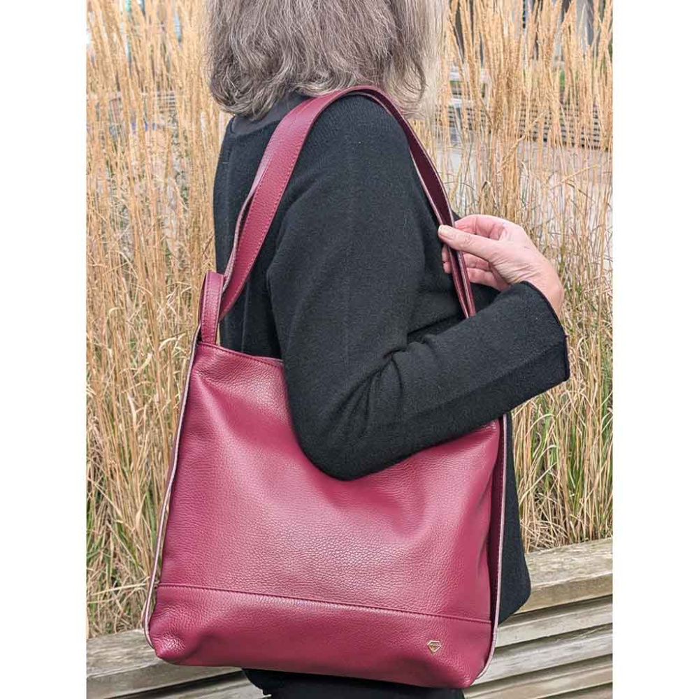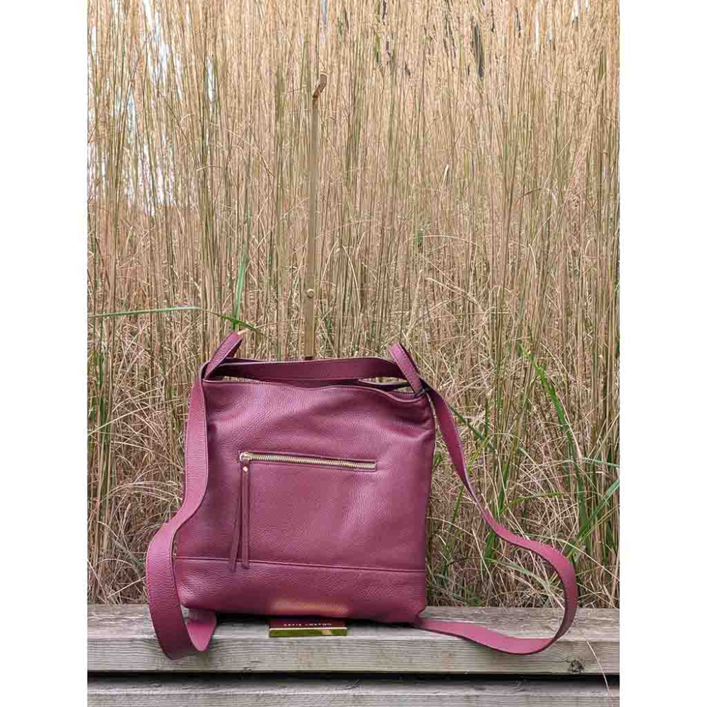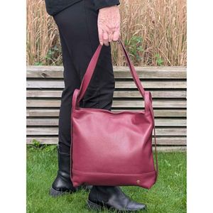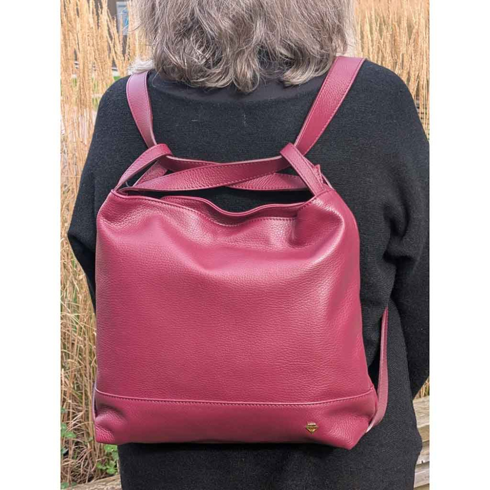 Caleidos skulderveske og ryggsekk i burgunder rød skinn – en smart 2-i-1 veske til dame.