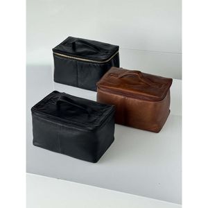 Tidløs toalettmappe i brunt skinn – perfekt for sminke, hudpleie og reise.